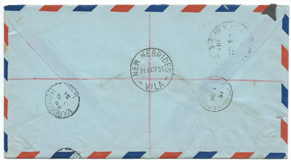 On back VILA 21 OCT 51, SYDNEY AIR 27OC51 in transit and VANCOUVER NO 1 51 in arrival.