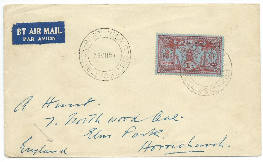 'CONDOMINIUM/NEW HEBRIDES/POSTMASTER' cachet in blue on reverse.