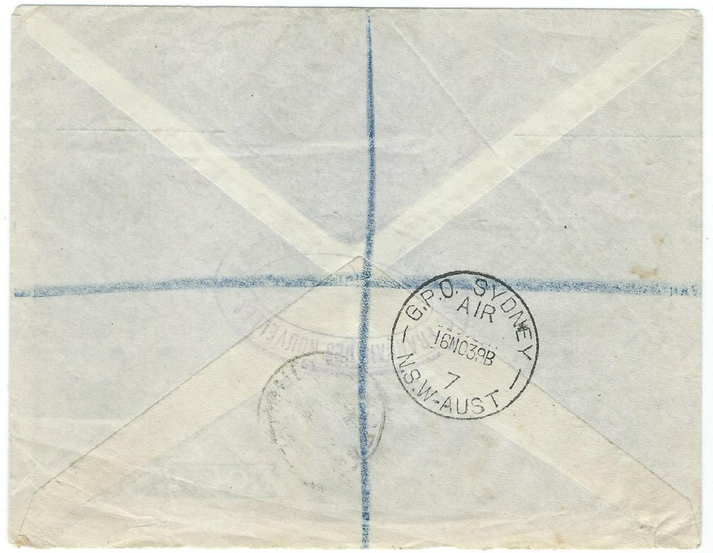 The Air Mail rates in the mid 1930s are very unsure. To our knowledge this cover should have been franked with 1/9d (2F10c) air letter rate per ½oz from Sydney and