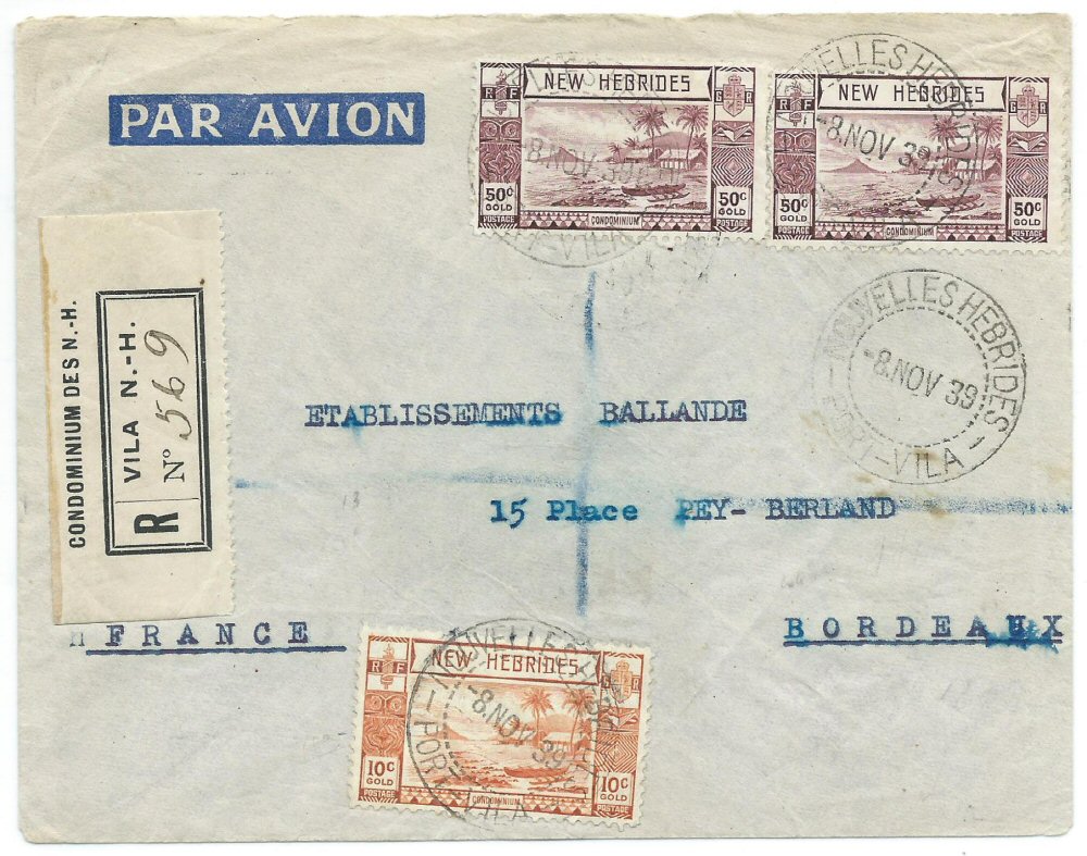 Registered to France but stopped and returned as 'undeliverable' to Vila. Colonial letter rate to France was 10 cg and the air mail