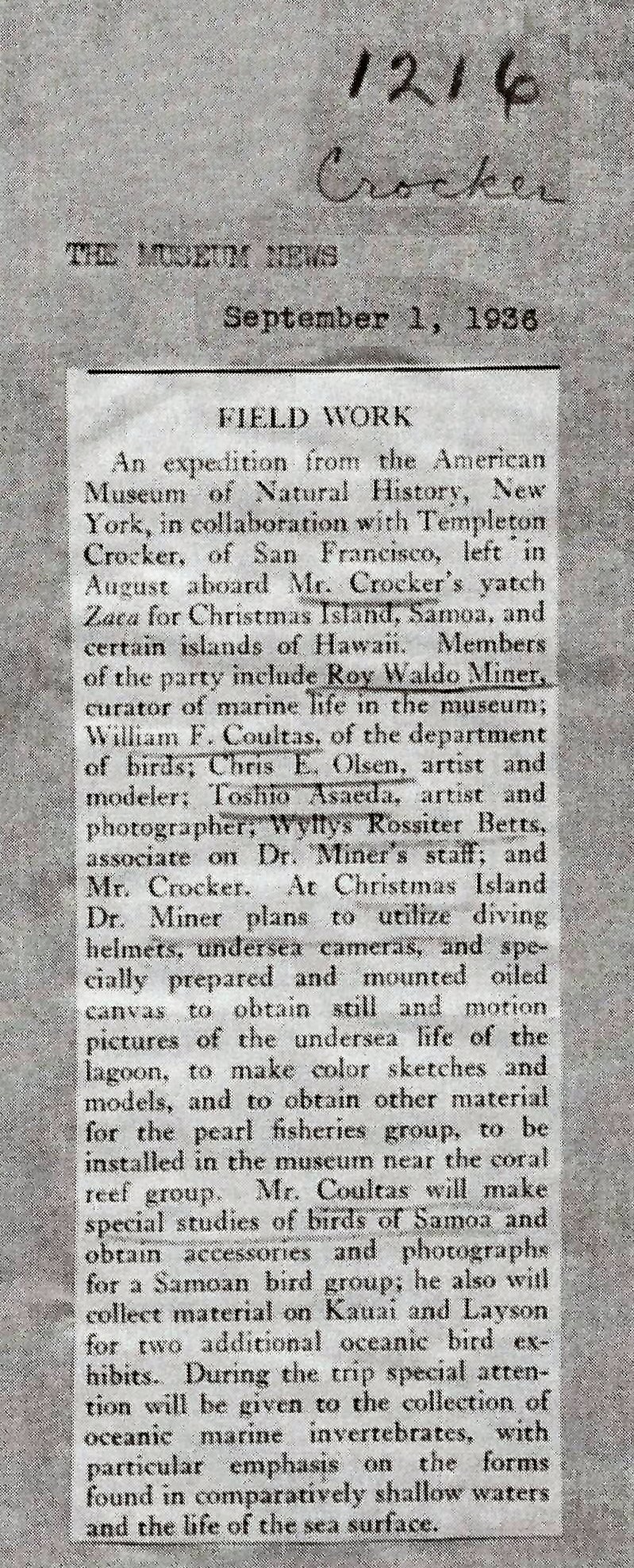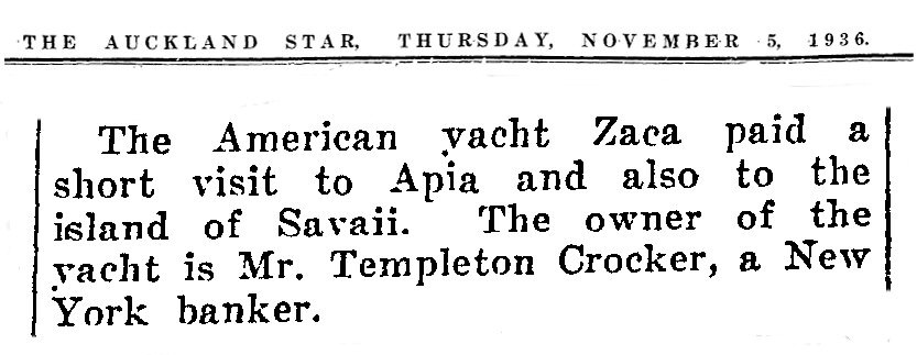 In 1936 Templeton Crooker on the yacht ZACA made an expedition to the Pacific for the American Museum of Natural History. Museum Curator Roy Miner