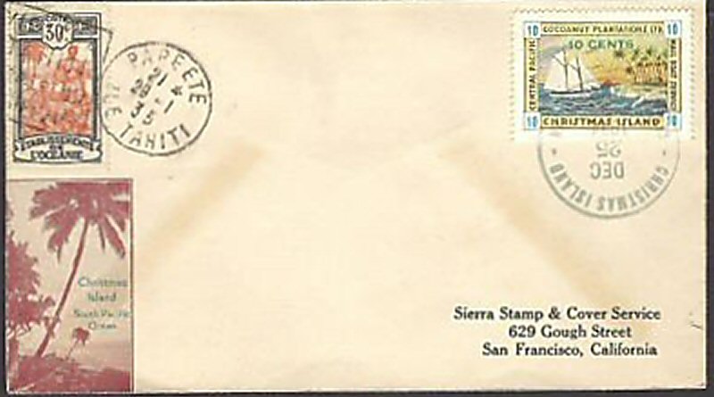 two color CACHET COVER with a Christmas Island and a Tahitian stamp cancelled on Christmas day. Send 35c NOW to ......