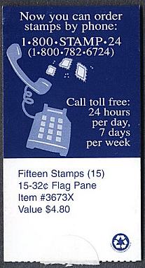 The pane stamps are not distinguishable from the stamps from these MDI (Minnesota Diversified Industries) booklets for vending machines as the booklets were made by parts of the pane. The booklet exists "Item #3673X".